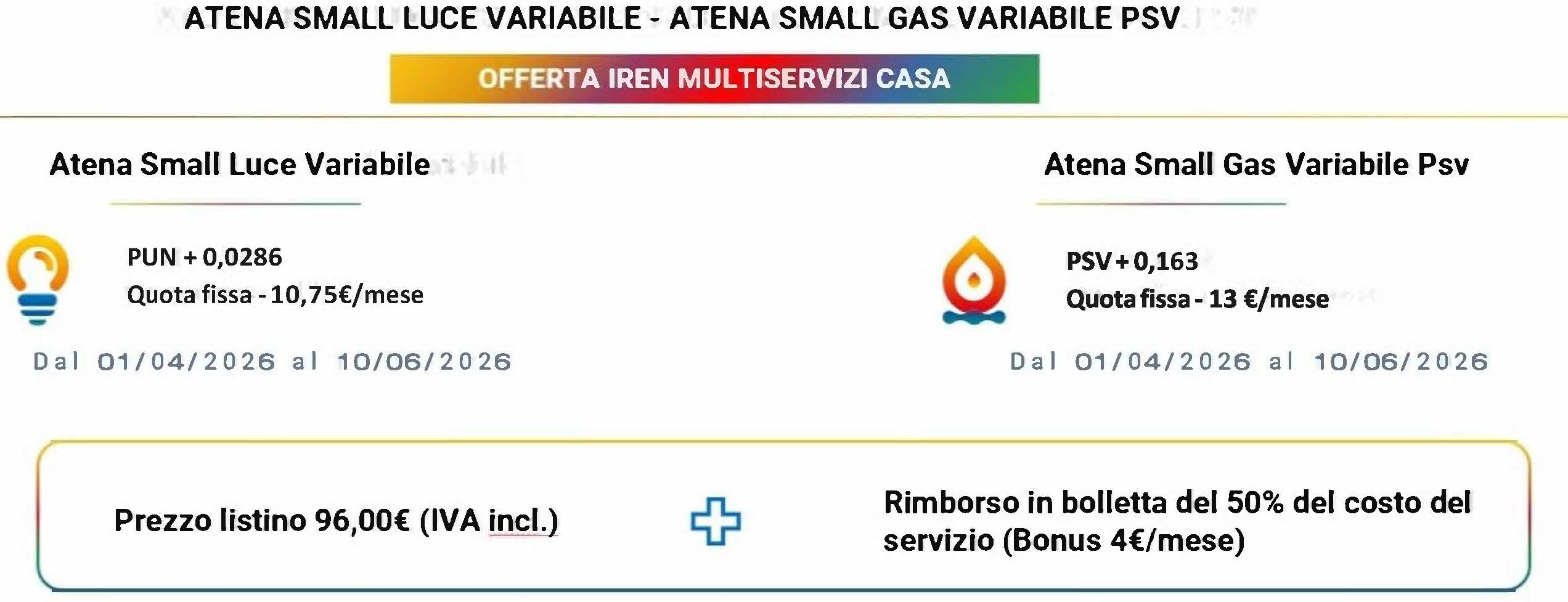 Se lo abbini a una delle nostre offerte ATENA SMALL LUCE VARIABILE (Codice Offerta: 000567ESVML03XX000AEDOASLV260610) o ATENA SMALL GAS VARIABILE PSV (Codice Offerta: 000567GSVML08XX00AGDOISMVA260610) puoi recuperare il 50% del costo! Paghi 8€/mese per 12 mesi e 4€/mese te li rimborsiamo noi con i bonus in bolletta, così in totale paghi 48€ invece di 96€*.